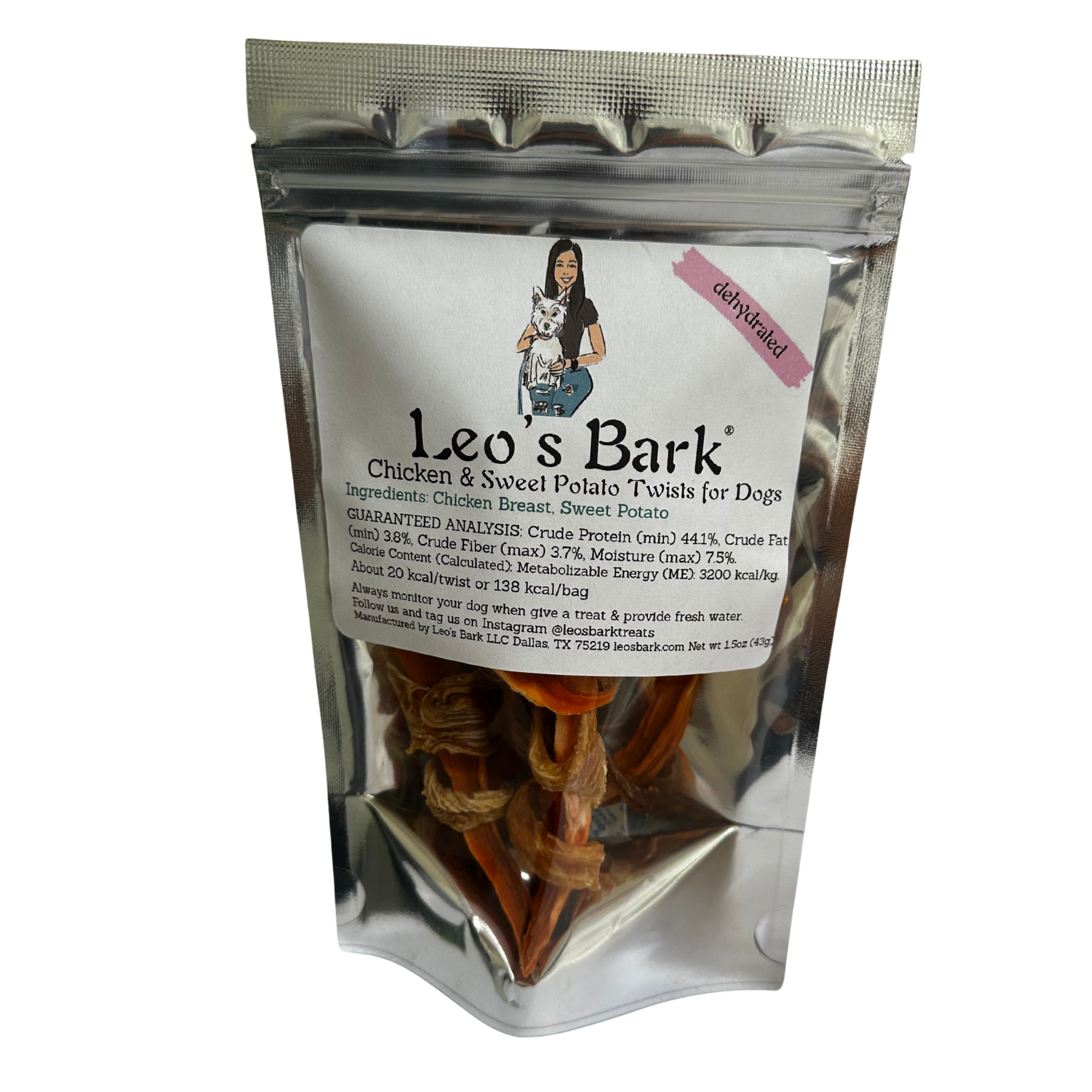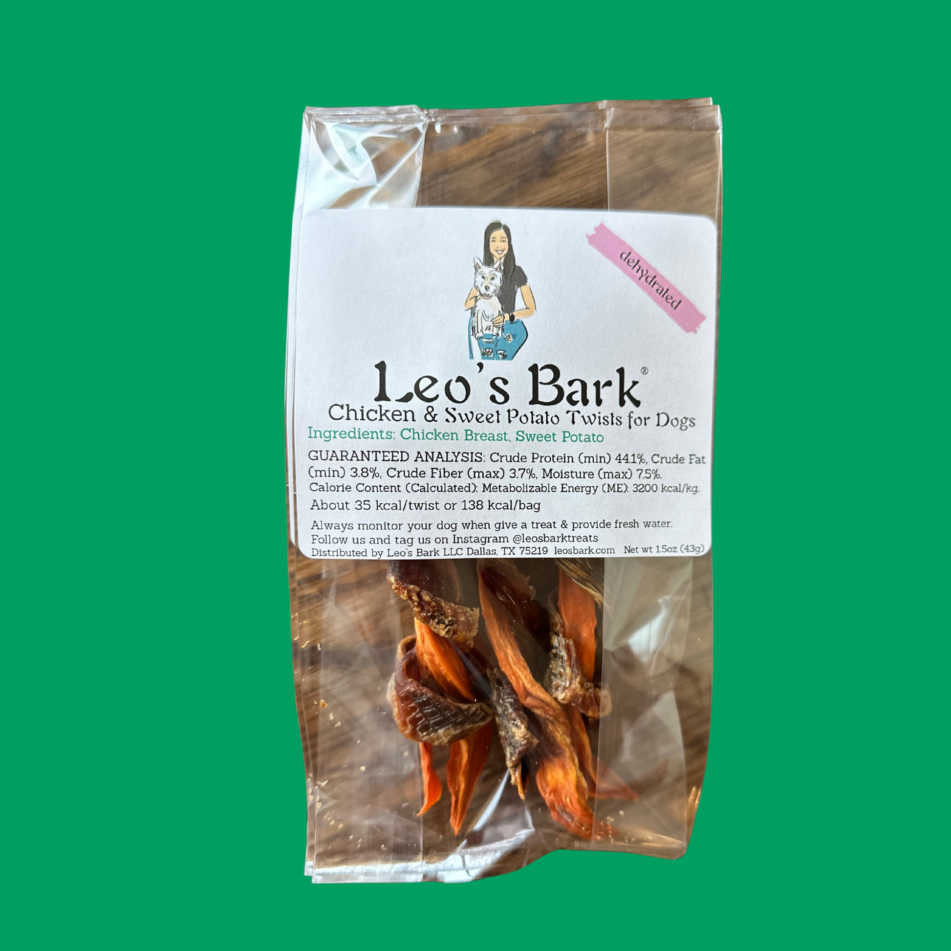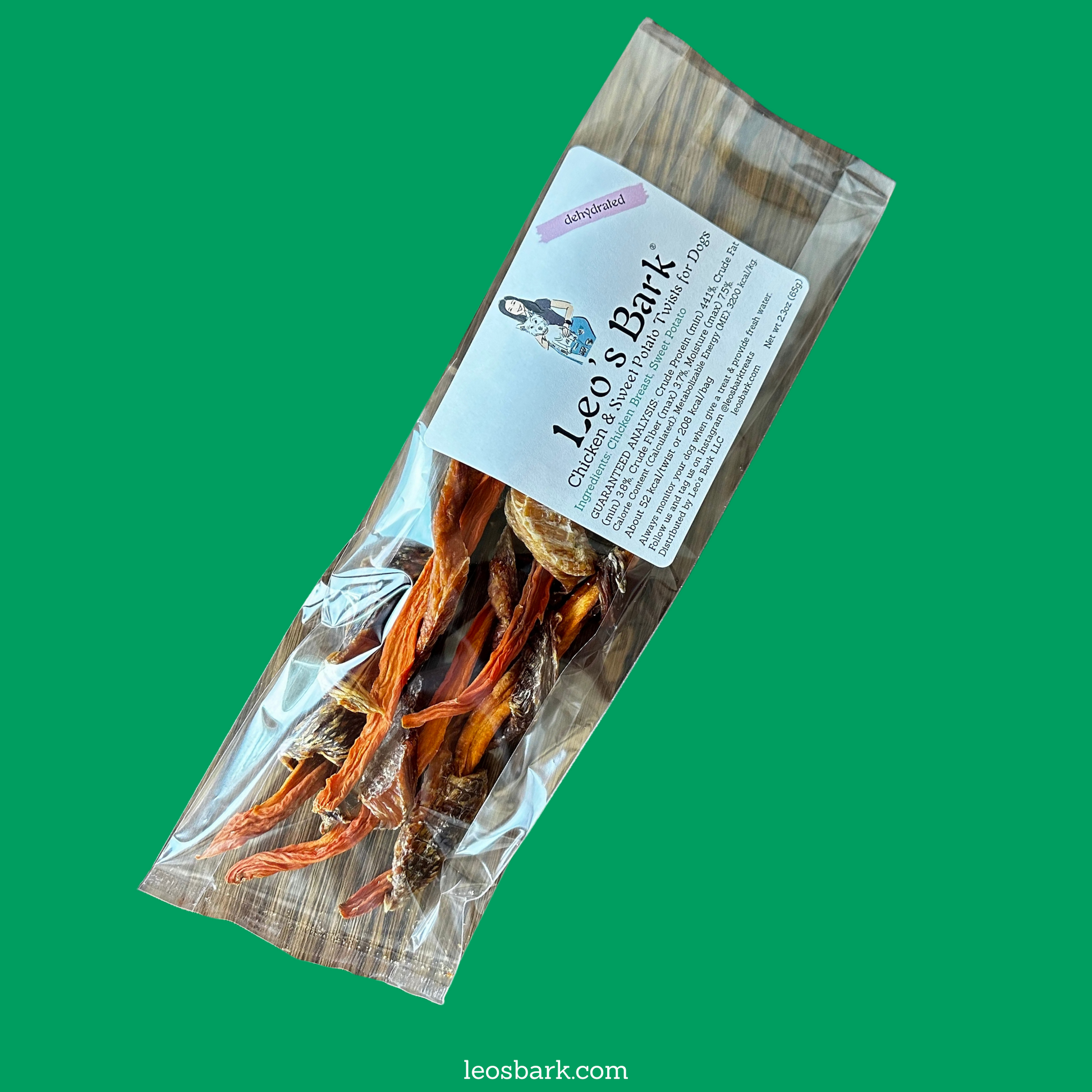 Crafted from hand-cut strips of USDA chicken breast and sweet potato, these twists are a simple, wholesome treat your dog will love. Each piece is individually twisted by hand—no rawhide, no fillers, just a naturally satisfying, highly digestible snack.